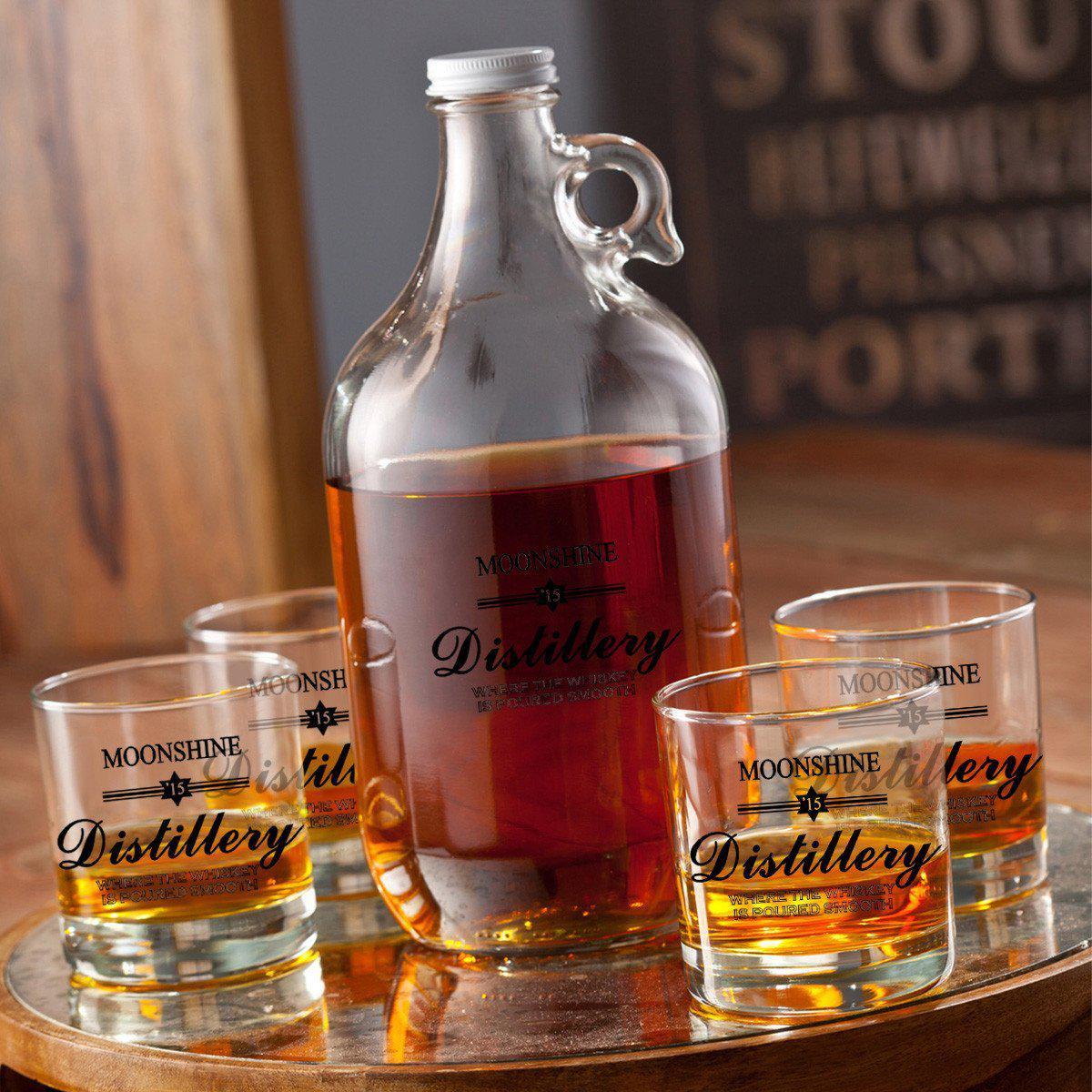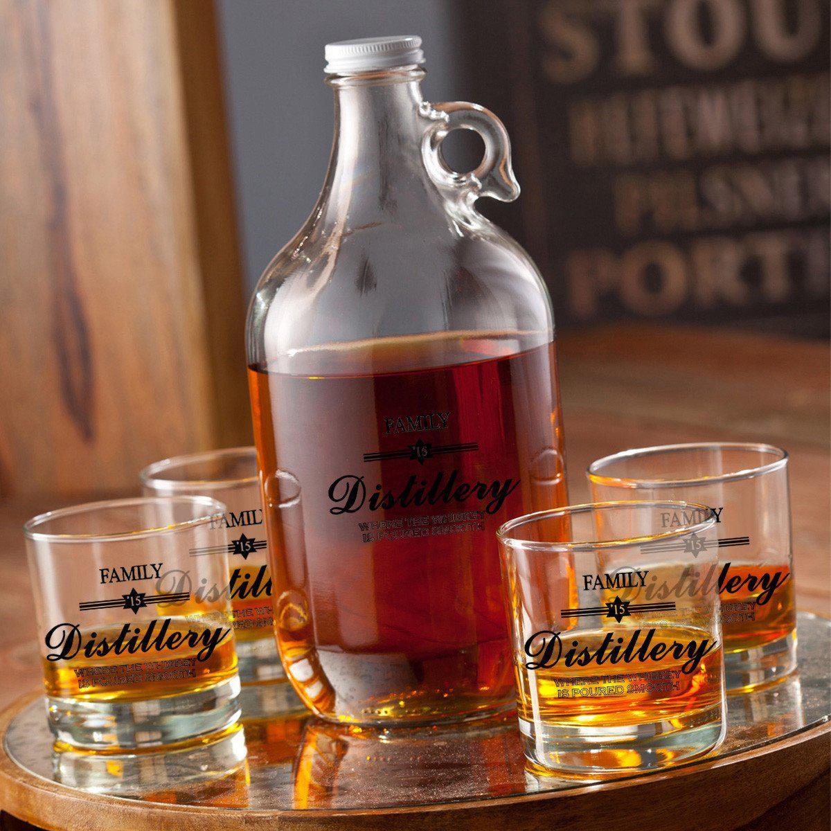 Give a gift set that is both personal and stylish with this personalized distillery label whiskey growler and glasses set. Customized with a classic printed brewery design featuring a first and last name, the set includes one 64 oz. traditional glass whiskey growler and four lowball sized pub style whiskey glasses. This unique set is a gift any fine whiskey lover will be sure to appreciate.
